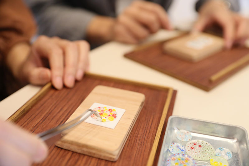 お好みのガラスパーツ(ミルフィオリ)を並べて、キルン(電気炉)で熔かし合わせるフュージング体験を開催しております。